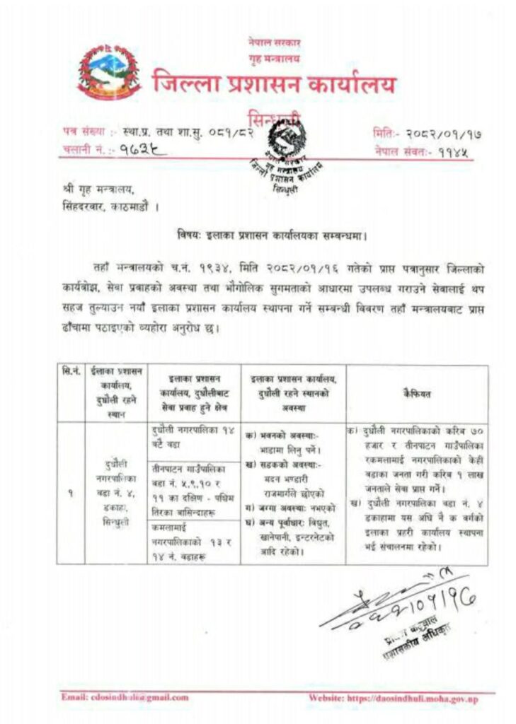 सिन्धुलीका दुर्गम पहाडिय भु-भागबाट दुधौलीका सम्पुर्ण वडा, तिनपाटन गाउँपालिका, कमलामाइ नगरपालिकाका केही वडाका सर्वसाधारण नागरिकतालगायत कागजात बनाउन २० देखि ५० किलोमिटर टाढाको सिन्धुलीमाढी आइपुग्नुपर्ने बाध्यता छ ।
