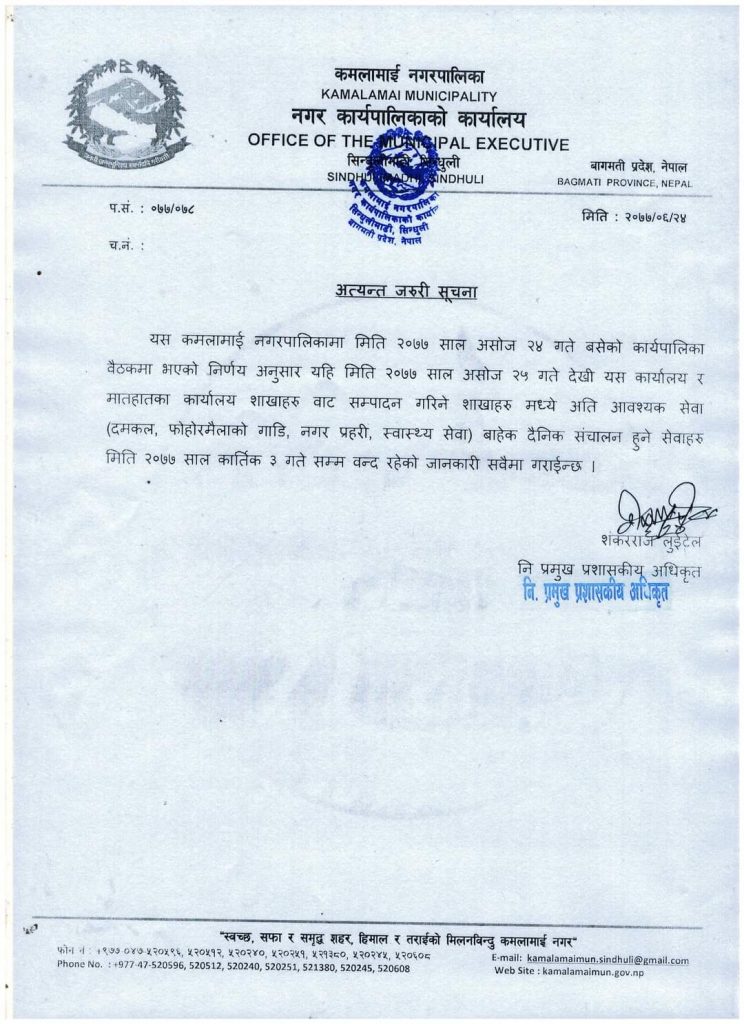 सिन्धुली । सिन्धुलीको कमलामाइ नगरक्षेत्र तथा जिल्लाको स्थानिय तहमा कोरोना सङ्क्रमणको जोखिम दिनप्रतिदिन बढेपछी कमलामाइ नगरपालिकाको अति आबस्यकिय बाकेकको सेवा कार्तिक ३ गते सम्मको लागि बन्द भयो ।