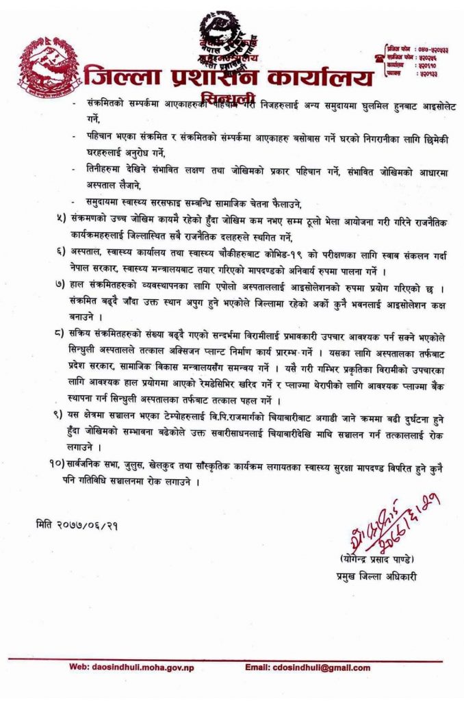 यतिमात्रै होइन प्रमुख जिल्ला अधिकारी योगेन्द्र प्रशाद पाण्डेको रोहबरमा प्रदेशसभा सदस्य, नगरप्रमुख, स्थानियतहका प्रमुख तथा प्रतिनिधी र सरोकार निकायको उपस्थितिमा असोज २१ गते सर्वपक्षीय बैठक बसि संक्रमणको उच्च जोखिम कायमै रहेको हुँदा जिल्लाभर कुनैपनी सार्वजनिक कार्यक्रमलाई स्थगित गर्ने निर्णय गरिएको छ ।