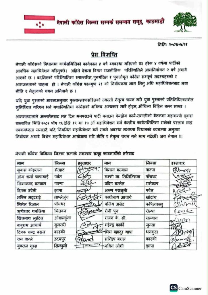 महामन्त्री गगन थापाले पेस गरेको पुस १६ को डेटलाईन भित्र महाधिवेशन गर्न सकिने पनि समुहले प्रष्ट पारेको छ । जेनजी आन्दोलनपछि हुन लागेको निर्वाचनमा नेतृत्व परिवर्तन गरि नयाँ जोस जागरका साथ निर्वाचनमा होमिन समेत सामुहिक हस्ताक्षर मार्फत समुहले आग्रह गरेको छ ।