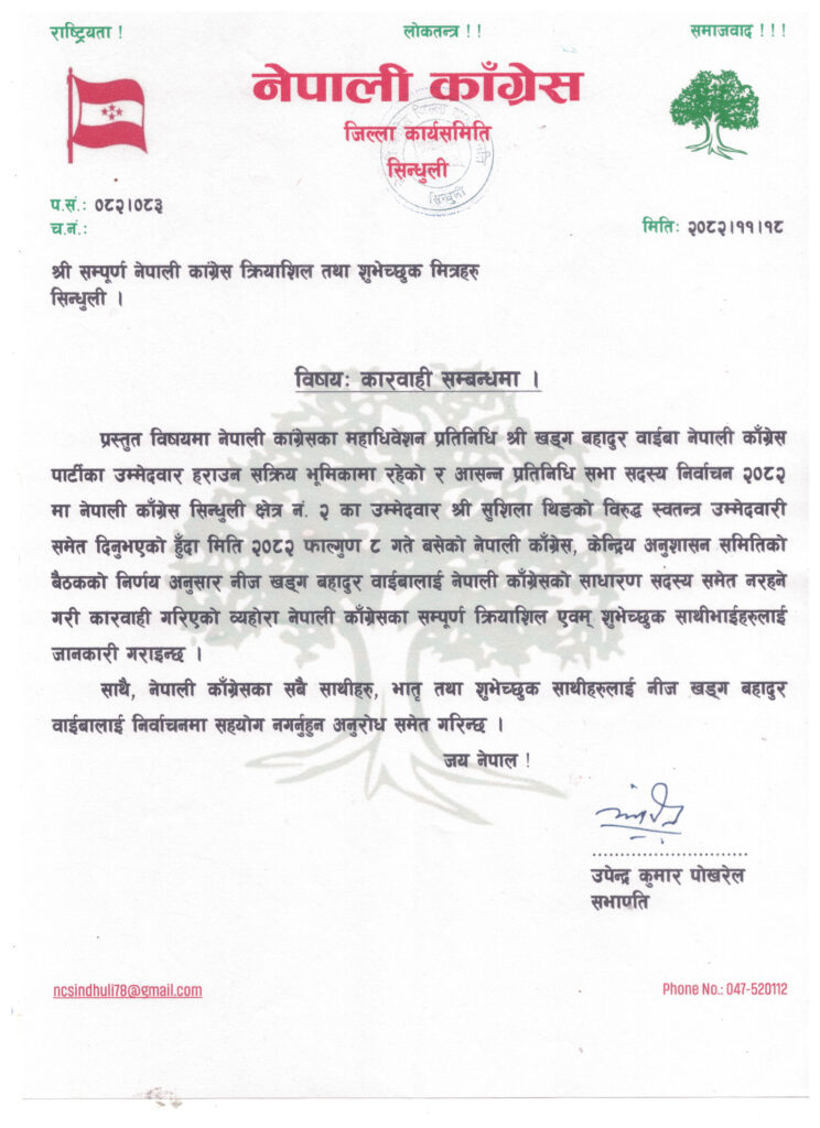 सिन्धुली, फागुन १८ — नेपाली कांग्रेस जिल्ला कार्यसमिति सिन्धुलीले पार्टीका महाधिवेशन प्रतिनिधि खड्ग बहादुर वाइबालाई पार्टीको साधारण सदस्यसमेत नरहने गरी निष्कासन गरेको छ ।