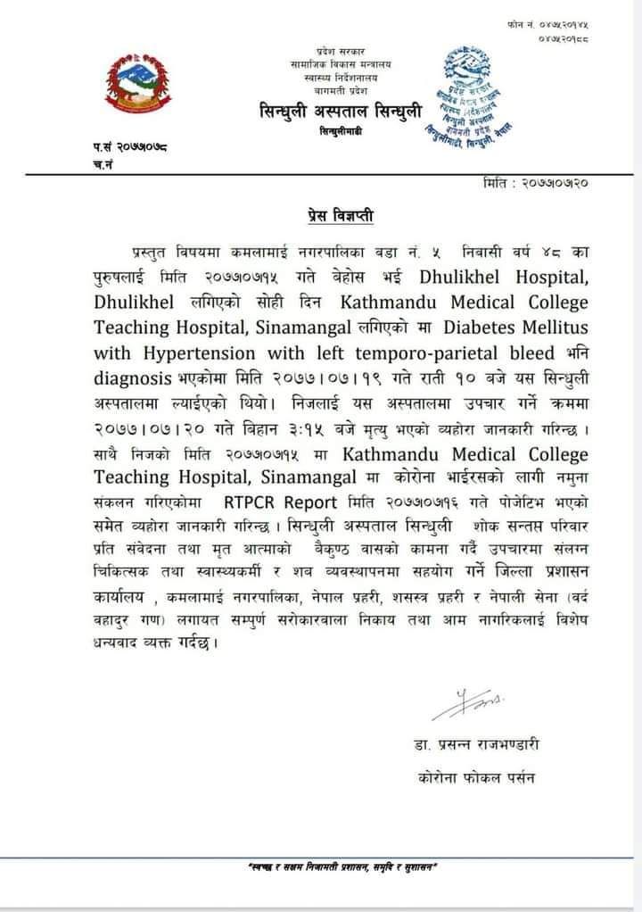 सिन्धुली । कोरोना संक्रमणका कारण कमलामाइ नगरपालिका -५ का खिलबहादुर मगरको बिहिबार निधन भएको छ । ४८ बर्षिय मगरको सिन्धुली अस्पतालमा उपचारको क्रममा बिहिबार बिहान मृत्यु भएको जिल्ला अस्पताल सिन्धुलिका ब्यबस्थापक बिमल श्रेष्ठले बताए ।