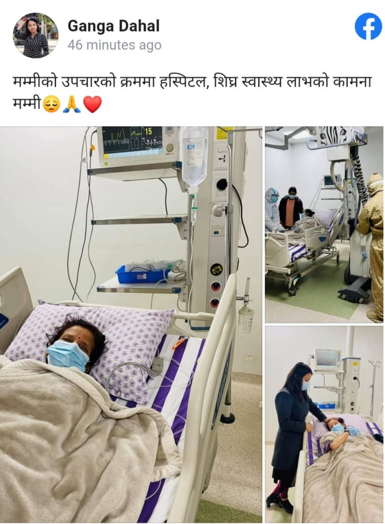 काठमाडौँ । नेपाल कम्युनिस्ट पार्टी (नेकपा) (प्रचण्ड–माधव पक्ष) का अध्यक्ष पुष्पकमल दाहाल ‘प्रचण्ड’ की पत्नी सीता दाहाल अस्वस्थ बनेकी छन् । अस्वस्थ बनेपछि उनलाई अस्पताल भर्ना गरिएको छ । छोरी गंगा दाहालले सीताको तस्विर सेयर गर्दै उनको उपचार भइरहेको जनाएकी छन् ।